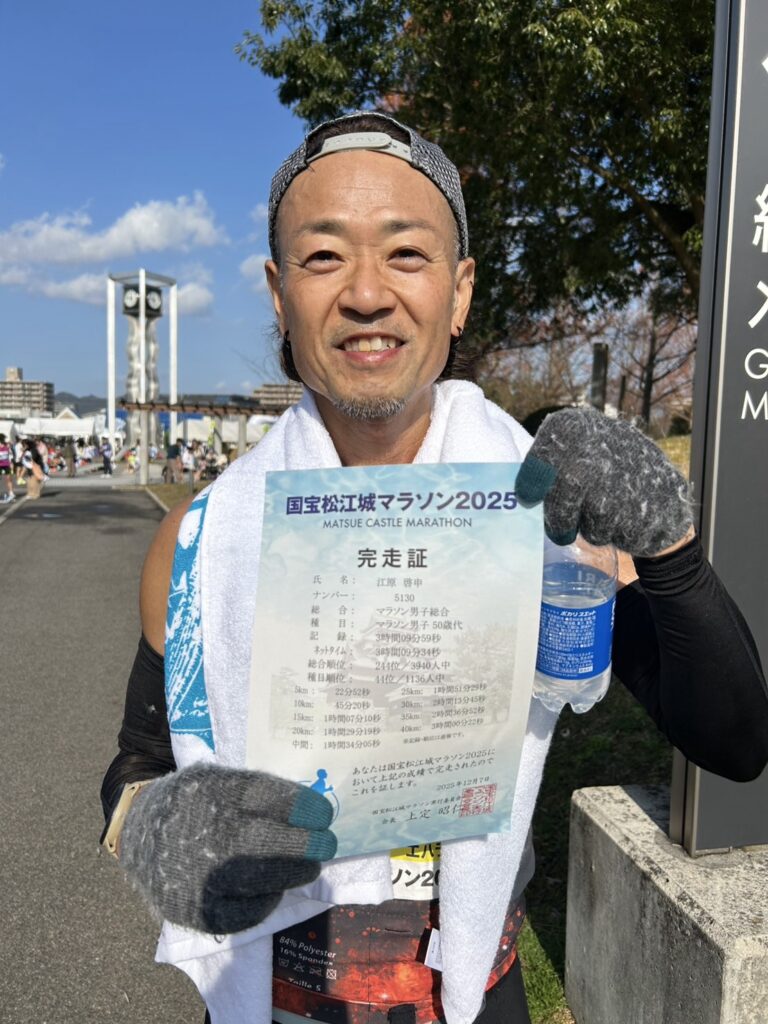 今思えばもう少し早く走れた様な気さえしますが、結果は3時間9分34秒で去年の松江城マラソンより6分近く更新